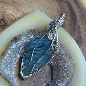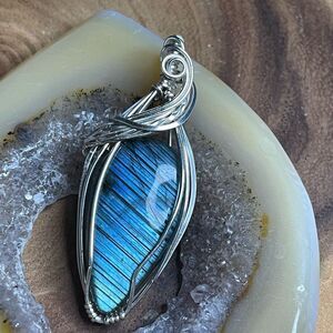 Artisan handmade barcode blue flash lined labradorite pendant wire wrap necklace silver-plated copper energy