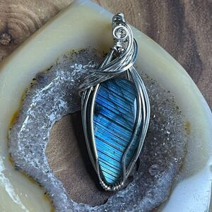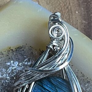 Artisan handmade barcode blue flash lined labradorite pendant wire wrap necklace