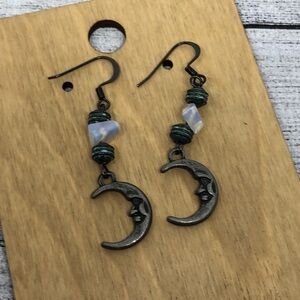 Handcrafted pewter moon with moonstone chip beads. Purposely oxidized brass bead.