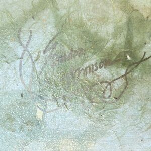 This signed table tray was created and made by artist sandra arorison. It is 10 x 30 inches. Could also be used on a bathroom vanity. Decoupage effect. Romantic floral print in muted tones of greens and golden tan. Neutral. Elegant. One of a kind. Euc