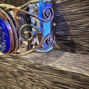 Elevate your accessory game with our exquisite Handcrafted 2in Wide Cuff Bracelet. Designed with a stunning Lapis Lazuli stone set in a unique mix of metals, this bracelet is a perfect blend of elegance and artistry.