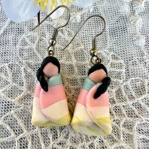 Lovely Native Maiden Earrings, handmade out of clay. A long black braid sweeps over her shoulder and she is wearing a robe of yellow, cream, pink and blue with subtle sparkles and swirls in the clay.