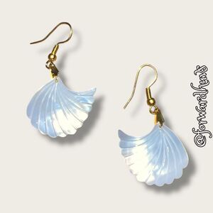 These exquisite earrings showcase hand carved Mother of Pearl shells, each measuring approximately 1 inch in length (not including the gold tone fishhook wire). The iridescent surface of the shell reflects soft hues of cream and pearl, while the delicate carving highlights the craftsmanship behind each piece.