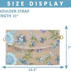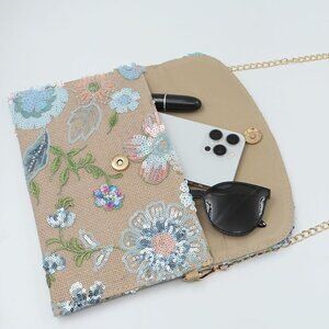 Features: Handcrafted high-quality straw with a dense weave, detailed sequin embroidered wreath design, and a sleek, simple appearance. Features a magnetic closure and ample space for sunglasses, keys, wallet, cosmetics, and phone. Lightweight and durable, ideal for carrying essentials without overload.