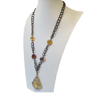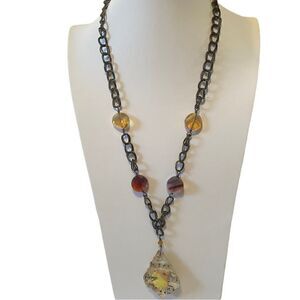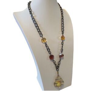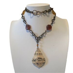 This Necklace features a Double Large Link Brass Chain w/Amber Beads. Pendant is a 3D Decoupaged Yellow Canary on the front side, and musical notes on the back.