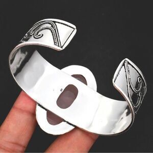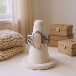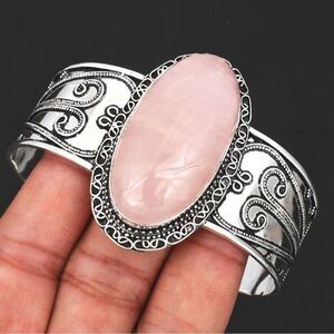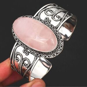 Elevate your style with this stunning artisan-crafted bangle bracelet, featuring a luminous oval rose quartz centerpiece set in intricately detailed silver. The soft blush hue of the natural stone radiates warmth and serenity, while the ornate scrollwork and filigree accents highlight the meticulous craftsmanship behind every curve.