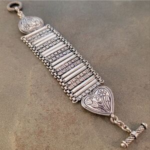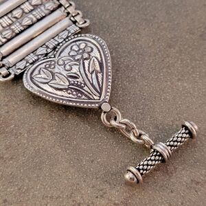 Stunning new handcrafted sterling silver wide with decorative raised embossed link bracelet with heart flower design ends, toggle clasp and black antiquing. Tested and confirmed as sterling silver. Made in Rasjathan, India. 2 SIZES! Just love this piece!