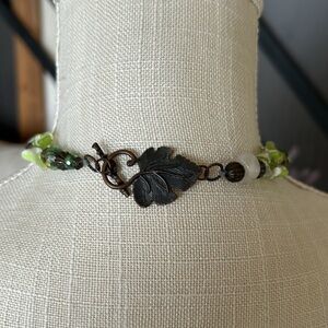 The necklace semi-precious gemstone chips, glass beads, and metal accents. Green and white gemstone chips, peridot moonstone. Round ribbed beads. Leaf clasp.