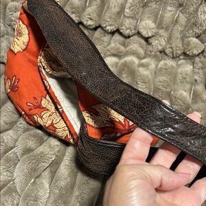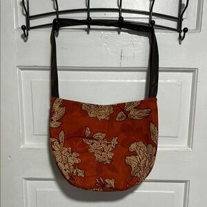 These shoulder bags showcase a stunning blend of orange and brown hues, enhanced by intricate floral embroidery. Crafted with an artisanal touch, they offer a unique and stylish accessory option. Perfect for those who appreciate detailed craftsmanship and vibrant colors.