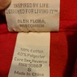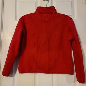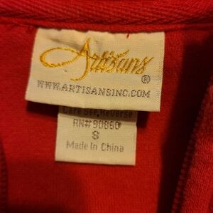 Stylish red garment by Artisans. A versatile addition to your wardrobe. Features full frontal zipper, embroidered design on front and sleeve, one front zippered pocket. Cozy cotton blend. Measures 18.5" pit to pit, lenght 20". Excellent condition. Smoke/ pet free home.
