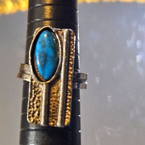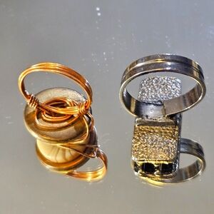 This exquisite ring set features a stunning combination of silver and gold tones. The silver ring is adorned with a captivating blue stone (faux turquoise), while the gold copper wrapped ring showcases a unique cream accent. Both of these are definitely inspired by the Southwest.