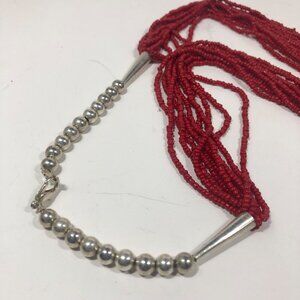 Artisian Red Seed Bead Necklace Boho Statement Silver Tone Pendant Southwestern