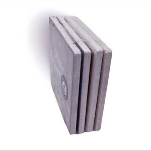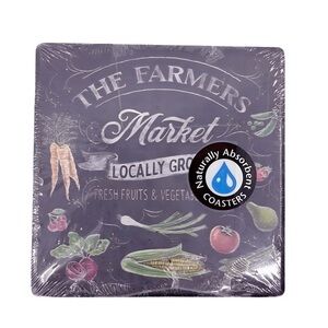 Introducing our Absorbent Ceramic Drink Coasters with Crok Back &! This artist-designed coaster set is perfect for protecting your tabletops while adding a touch of style to your space. Measuring 4”x4” square, these coasters are made of absorbent stone with a cork backing for added stability. The set includes 2 Farmers Market themed coasters and 2 Drink coasters, all featuring the same design. They make a great housewarming gift too! Don't let those pesky drink rings ruin your furniture - invest in these high-quality coasters today.