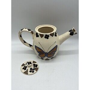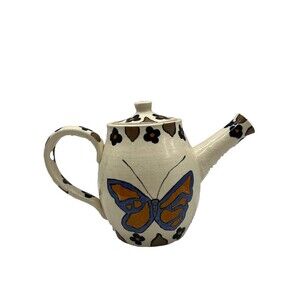 Artist Handmade Glazed Pottery Pitcher Butterfly Floral Design Spring Decor