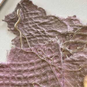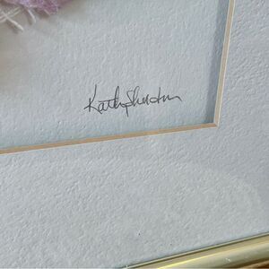Enhance your space with this elegant signed abstract art piece. Featuring a gold frame and subtle pink and purple tones, it adds a touch of sophistication to any room.