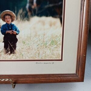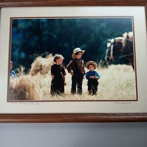 This beautiful photograph captures the essence of Americana with a stunning landscape of children playing in a wheat field. The image is framed and measures 11 x 14 inches, featuring vibrant colors that bring the scene to life. The photograph is an original, signed by the artist Irvin Hoover, and is a limited edition piece. The image is perfect for those who appreciate documentary, landscape, and minimalist styles of photography. It is a single piece and is not an antique or a licensed reprint. The photograph is numbered and features the artist's signature. The subject of the photograph is the Amish people, specifically children girls. The photograph is a great addition to any collection and is perfect for those who love to capture the beauty of nature and humanity.