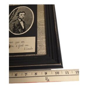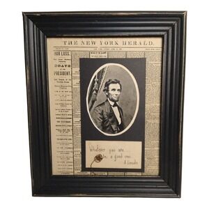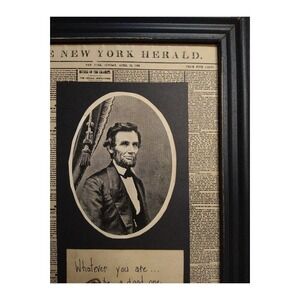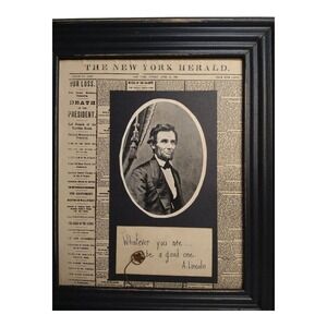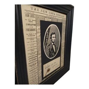 This product is a paper art of an aged reproduction of a Lincoln assassination newspaper cover page. The print features a quote. It is a great depiction of a historical piece that captures a significant moment in American history. Signed by an artist Cindy Armstrong on the back, made in USA.