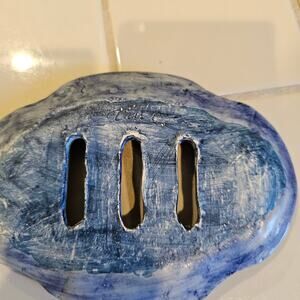 Artist Signed Blue Floral Impressed Pottery Soap Dish Nature-inspired Soap Rest - NEW! One-of-a-kind soap caddy adds beautiful nature accents to your bathroom or kitchen decor. Beautiful soap rest features intricate floral design impressions and a lovely blue glaze, making it both functional and decorative. Handcrafted by a talented artist and signed for authenticity, this unique soap dish is sure to elevate your daily cleansing routine. Add a touch of artisanal elegance to your space with this handmade pottery piece. Soap, trivet, and blue q-tip jar are not included. only the pottery soap dish.