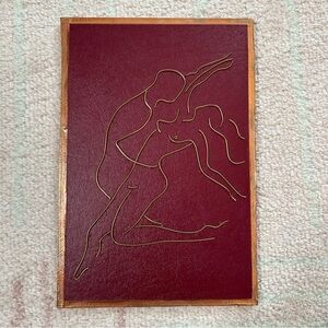 Embracing couple figural art done in copper wire on maroon leather backing ,unsure if real or faux leather.