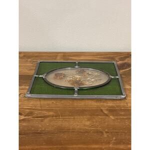 Beautiful artist-signed stained glass art panel featuring real pressed flowers set in a charming oval frame. The background includes rich green stained glass with a clear oval center showcasing the floral arrangement. Artist signature is etched on the back but is illegible. A perfect window or wall piece for lovers of vintage, botanical, and cottagecore décor.