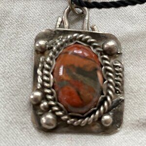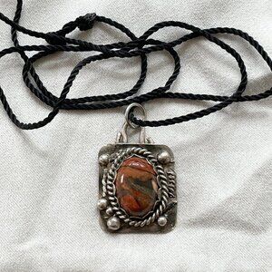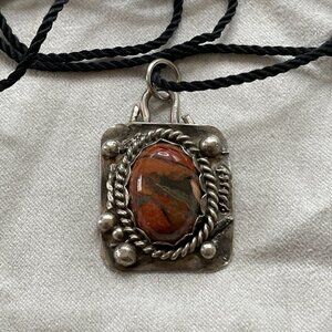 Large cabochon red jasper stone with gorgeous markings is set in a square of silver with beaded dots and rope trim. Has a black cord but you can change if you prefer.
