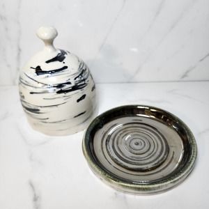 Artist Signed Studio Art Pottery Butter Dish Butter Keep with round Lid and Base. Black and Gray Swirls with white background. Beautiful butter dish to add to your modern or vintage kitchen decor. Has a very small chip on the bottom of the lid, but cannot see it from the outside.