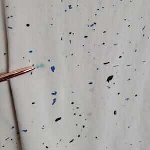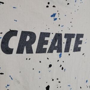 A cute "Create" graphic tee 100% breathable cotton with paint splatter design and possibly some extra stains not in original design highlighted with pointer. By Ricky Singh with Denim & Flower.