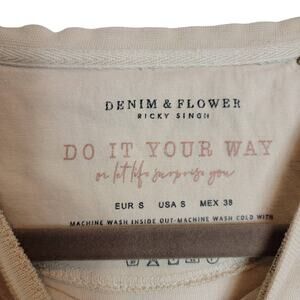 Close up of brand tags, fiber content, size and measurements provided in photos.