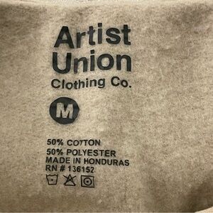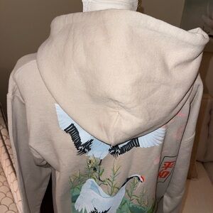 Artist Union hoodie with Japanese cranes. Unisex tan hooded sweatshirt. Drawstring hood and kangaroo pocket. Cranes on the front and back. Approximate measurements laying flat: the chest is 21” and the length is 26”. New without tags. Size M