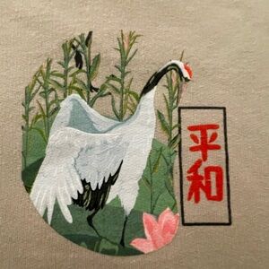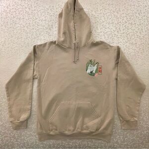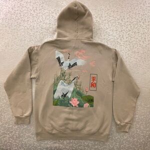 Artist Union hoodie with Japanese cranes. Unisex tan hooded sweatshirt. Drawstring hood and kangaroo pocket. Cranes on the front and back. Approximate measurements laying flat: the chest is 21” and the length is 26”. New without tags. Size M