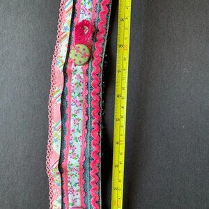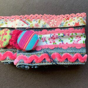 Artist made cuff bracelet. 10" in length, the base is denim, and I added velvet ric rac, floral ribbons, and two bright buttons. All in pink combinations. Closure is a ribbon with elastic. There is also a velcro closure on the inside the keep the bracelet flat when wearing it. One of a kind. Great conversation piece.