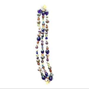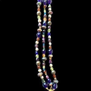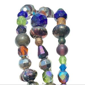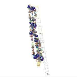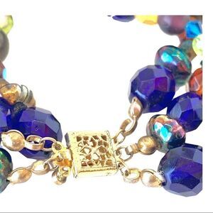 Beautiful glass beaded triple strand bracelet made by Sonoma jewelry artist Lisa Jo Silberkleit, the bracelet has a beautiful sterling silver clasp with a gold wash( vermeil). The beads are glass faceted in blues and green, some metal beads in silver and bronze. The bracelet measures 7.5” in length approximately 1” wide. Beautiful colors and design. Please see all photos for full description,