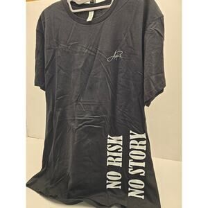 This is a new without tags, black, 100% cotton t-shirt, size large, with a "No Risk No Story" quote. The shirt is artist signed, making it a unique and motivational piece. This men's large top is a signature edition tee. Perfect for anyone who loves inspiring messages and comfortable, high-quality clothing.