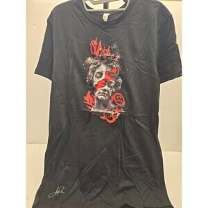 Elevate your wardrobe with this unique, artist-signed black cotton t-shirt! Featuring a striking red and gray sculpture print, this size medium tee is a wearable work of art.