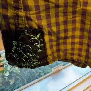 The short is in excellent condition. It’s navy blue and green check. It has coordinating pattern on flip cuffs and collar. Monogram embroidered logo on the chest. See photos for measurements.