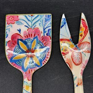 Elevate your cheese and appetizer presentation with this Artistic Accents Handcrafted Appetizer Cheese Serving Set. This elegant set, featuring a floral pattern with a resin topcoat on one side and a gold finish on the other side which brings a touch of sophistication to any gathering. The resin-coated metal construction ensures durability while the glossy finish adds a lustrous appeal to your table setting. Included in the set are cheese knives and spreaders, a fork, and a server, all designed with a beautifully intricate floral pattern. The multicolor palette allows for versatile pairing with a variety of cheeses and appetizers, making it a perfect addition for your next entertaining event or a chic display in your cheese course.
