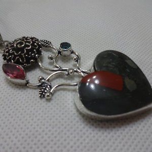 Artistic "FANCY JASPER & PINK/BLUE TOPAZ" FLORAL HEART HANDMADE Necklace 694A