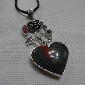 Artistic "FANCY JASPER & PINK & BLUE TOPAZ" FLORAL HEART Handmade Sterling Pendant on a 18" Black Leather #694A