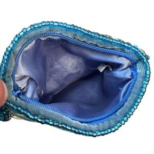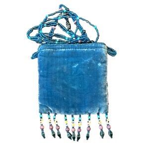 Charming mini blue velvet crossbody bag with artistic beadwork and a unique centerpiece. Ideal for adding a bohemian flair.