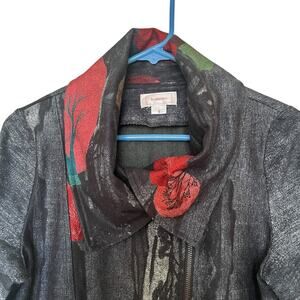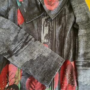Stylish Navy Blue denim appearance jacket or tunic with vibrant red and green tree print. Unique artistic design. Asymmetrical full front zip. Two zip close pockets. Cowl neck. A-line shape with shark bite hemline. Pair with your favorite jeans or leggings.