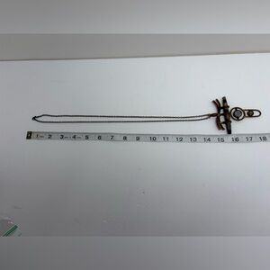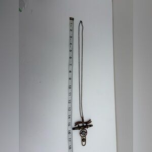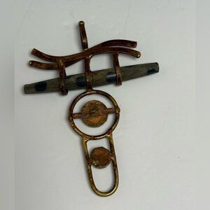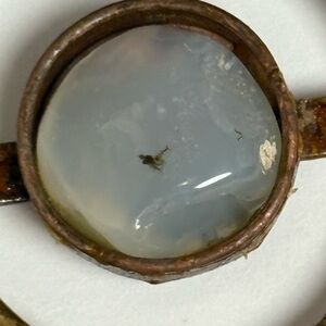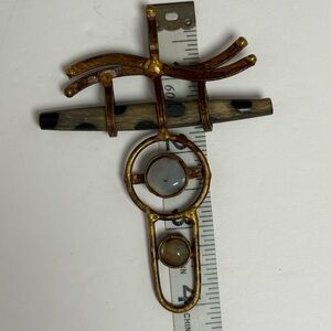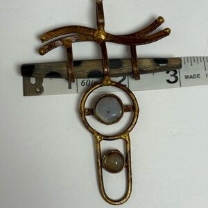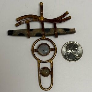 Unique vintage statement necklace with artistic metal design and stone accent pendant on long bronze-colored chain. Features brown and bronze tones. 18” drop. Gorgeous to show your artistic side. Excellent vintage condition.