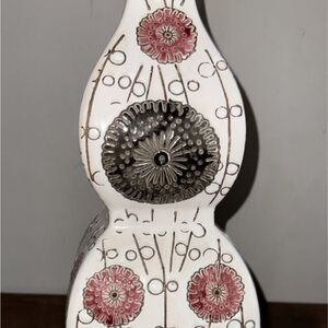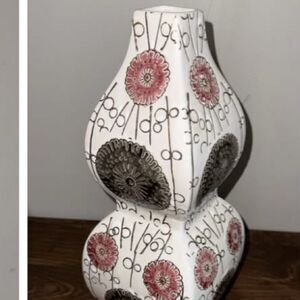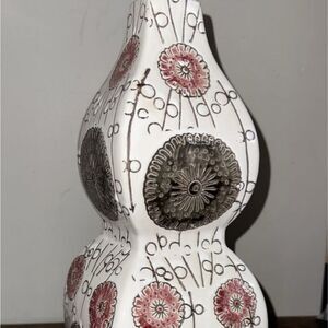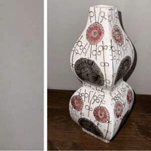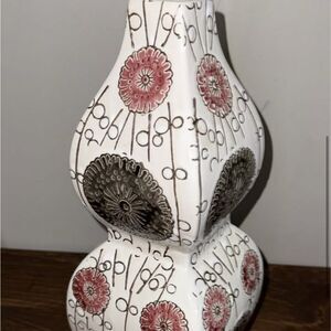 Charming white vase adorned with artistic floral designs in pink and gray. A stylish addition to any decor.