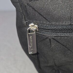 Spacious black Artistry cosmetic/travel tote with subtle starburst jacquard pattern. Features a zip-top closure, interior storage, and an exterior zip pocket with branded Artistry zipper pull. Lightweight and easy to carry — great as a travel makeup bag, everyday tote, or work carryall.