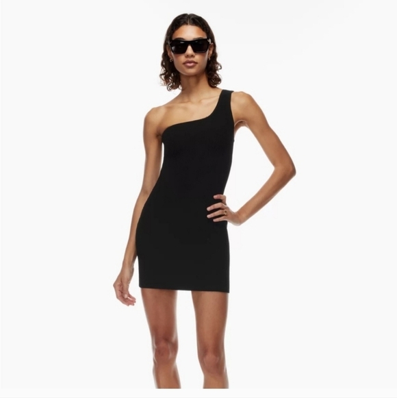 This is a one-shoulder mini dress with fully fashioned construction. It's made with Sculpt Knit - Babaton's signature figure-smoothing yarn. The perfect amount of stretch hugs in the right places to shape and sculpt your form. This version is constructed using an Ottoman stitch with close distinct ribs for a structured and textural feel.