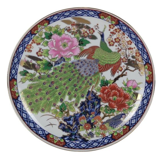 Beautiful vintage Artmark Japan decorative plate featuring vibrant peacocks surrounded by colorful florals, branches, and Imari-style border patterns. This plate displays rich detail with deep blues, reds, greens, and gold accents.