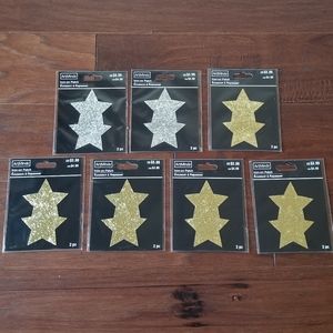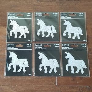 Artminds iron-on patch. This listing is for all patches shown above, which includes 7 packs of glitter stars, 8 sequin rainbows, 6 iridescent unicorns, and 1 french fry patch. One star has a bit of glitter that was missed (see last picture). They are all new with tags and retail for $3.99 each.