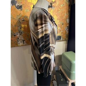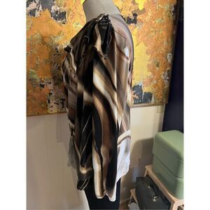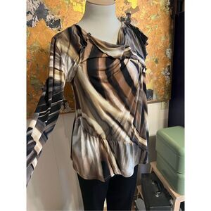 I love this top! This has some great, flattering details like an asymmetrical partial elastic across the hips to create shape and an asymmetrical flowy collar! There is a little ruffle on one shoulder. S interesting! The colors are flattering to most! Size says 1G-XL. Poly spandex to hand wash. tons of stretch!