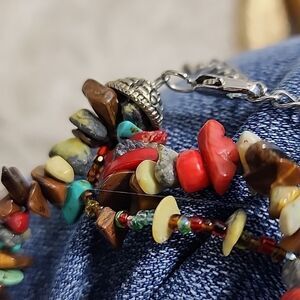 Colorful Triple Strand Necklace made with ceramic beads, seashells, stones and seed beads.  Perfect Necklace for a tropical getaway