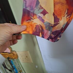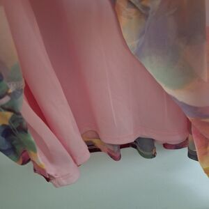 A very cute women's top by Cupio. This is an abstract artsy pattern that is a colorful floral print. the long sleeves on this piece are shear, and the bodice has a pink lining with a shear overlay. This has ruffles around the neckline and also ties. This is soft and flowy. 94% polyester and 6% spandex. 26" from pit to pit and 28" from shoulder to hem.