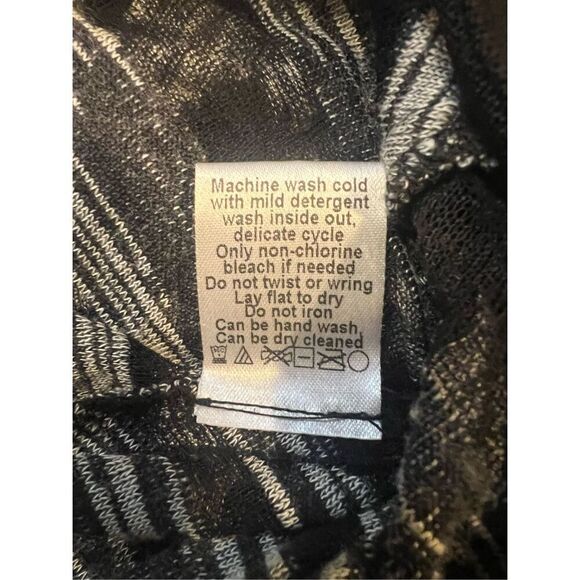 I love Komarov! This is a unique tunic with an artsy flair! There are stripes going in different directions and at the top of the tunic, there are hook and eye embellishments. This has black trim at the hem line and is quite sheer very stretchy and generously sized no visible flaws. This is an acrylic and wall blend to machine wash.